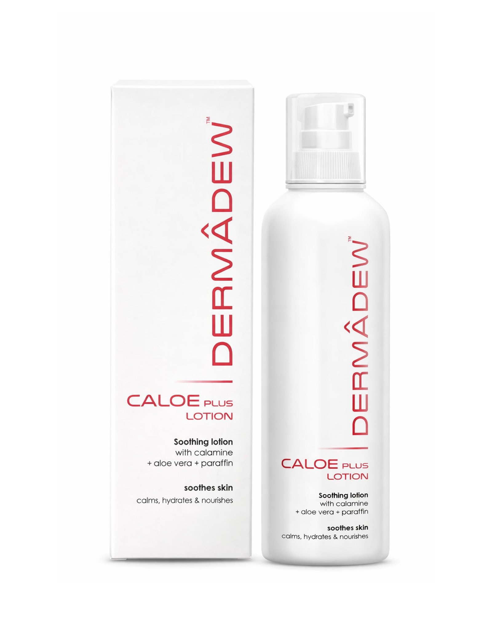 Dermadew Caloe Plus Lotion contains Aloe vera gel, light liquid paraffin, and calamine. Dermadew is the best used emollient and potent moisturizer acts by hydrating the skin, makes skin soft, silky & supple. It protects the skin from drying, chipping, and getting scaley.